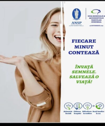 Pe 29 octombrie, este marcată Ziua Mondială de prevenire a Accidentului Vascular Cerebral – ,,Fiecare minut contează. Învață semnele. Salvează o viață!,,