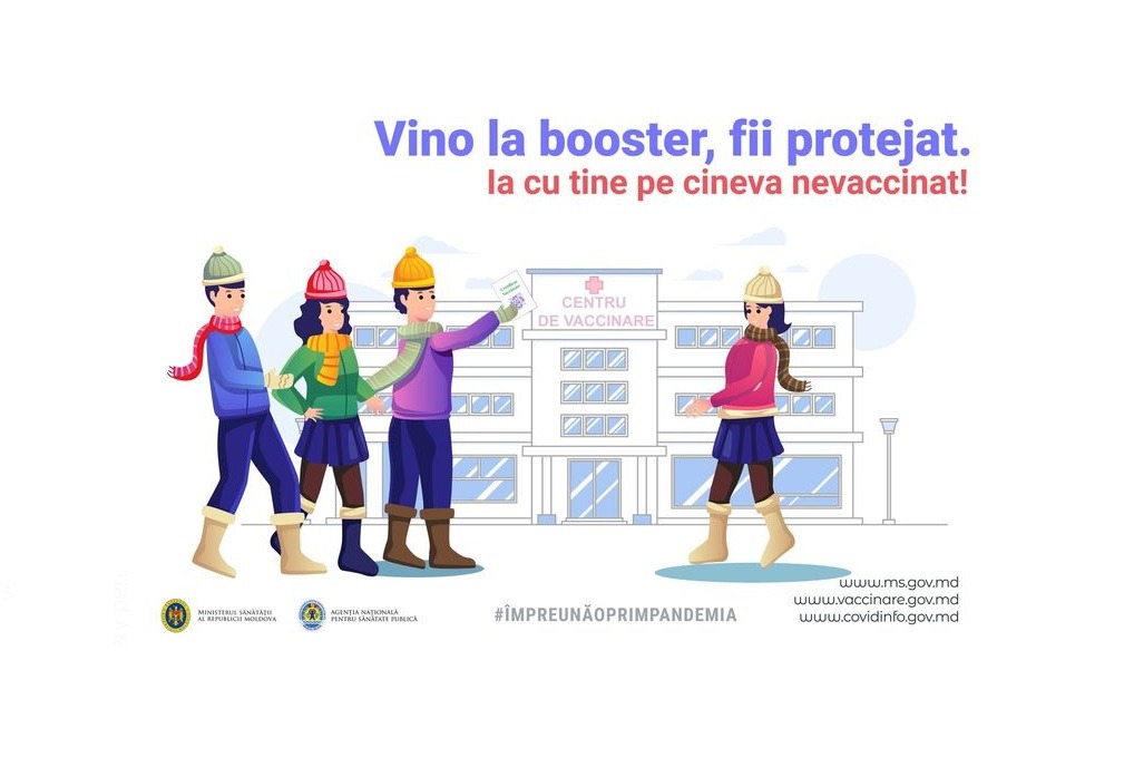 Vino la booster, fii protejat! Ia cu tine prietenii, care nu s-au vaccinat. Pentru imunizare, adresează-te la medicul de familie sau la oricare centru de vaccinare. Oferă grijă şi primeşte siguranță! #ÎmpreunăOprimPandemia #VaccinareaSalveazăVieți