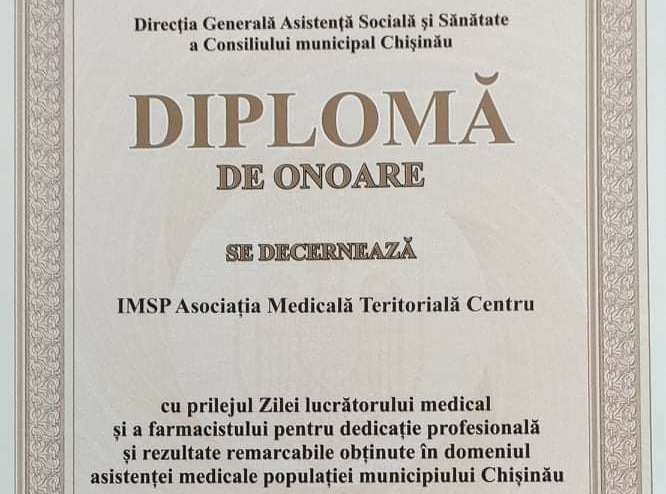 Pentru succese remarcabile, activitate prodigioasă și rezultate înalte a fost acordată Diplomă de onoare. Mulțumim pentru apreciere!